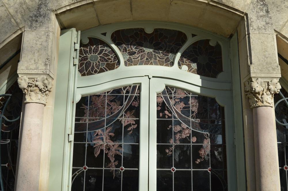 Dès mon arrivée, une immense porte se dresse devant moi, je me sens toute petite, elle me paraît infranchissable. Divisée en plusieurs parties de vitraux colorés et peints, elle déploie avec originalité les courbes d’un arbre ou d’une plante, éléments typiques de l’Art Nouveau. On peut y voir d’énormes chapiteaux décorés de branches de vigne, voilà ce dont parlait Madame N.