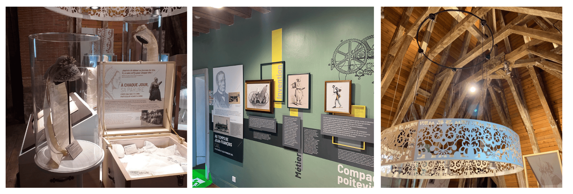 « Trois dames me reviennent particulièrement en mémoire lors de ma toute première réunion de travail sur le projet. Elles semblaient très complices. Je me suis retrouvée touchée par leur regard à l’annonce de nos premiers ressentis sur le projet, à la façon dont nous allions pouvoir offrir une belle mise en valeur des coiffes » Des étoiles plein les yeux, elles réalisaient l’espoir tenace de transmettre le savoir-faire des coiffes. Celui du doigté délicat et agile des couturières qui inlassablement pique le tissu, le modèle, le sculpte pour orner la femme de son enfance à ses vieux jours. Elles se rendaient compte que nous allions pouvoir toucher plus de visiteurs par une mise en scène plus moderne « L’espace dédié aux coiffes reste sans aucun doute l’endroit que je préfère. Sur le papier, ce n’était pas la partie du projet la plus évidente. Je ne suis pas de la région et n’ai pas connu mes grand-mères ou arrière-grand-mères ornées de coiffes. Mais je sentais qu’il fallait trouver la manière de faire honneur à ces œuvres et à leurs couturières. Aujourd’hui, je trouve l’endroit emprunt de magie, d’authenticité et d’empathie. J’ai d’ailleurs hâte de faire la visite avec mes deux filles pour partager avec elles toute la délicatesse autour du monde des coiffes.»