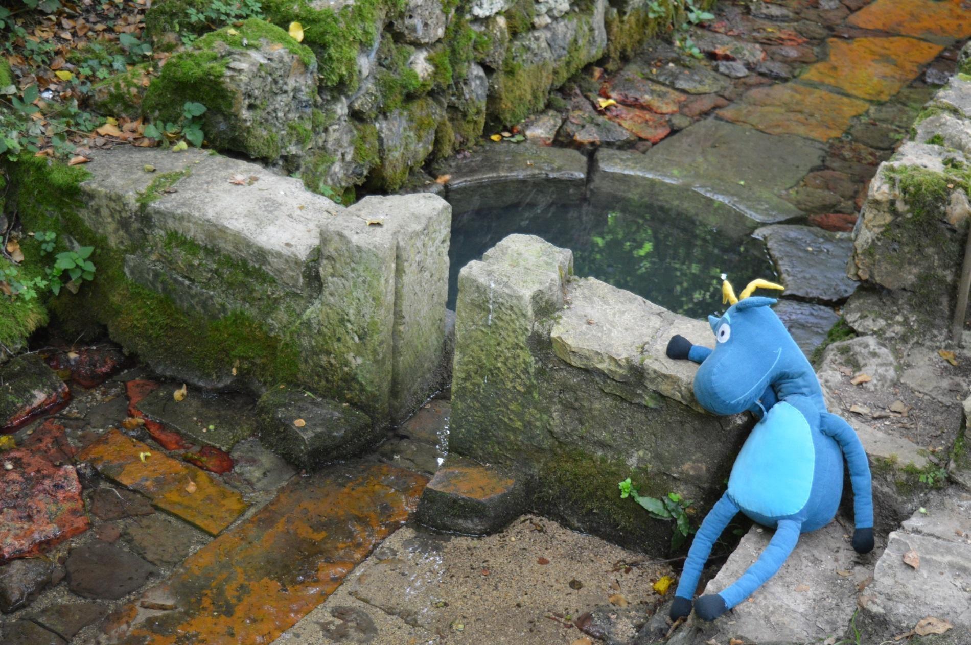 Je découvre une petite fontaine et apprends que cette source, baptisée ainsi au début du VIe siècle par Saint-Junien, est réputée pour ses eaux ferrugineuses et miraculeuses. L'eau y est limpide et semble immobile. On dirait que le temps s'est arrêté. Seules quelques pièces au fond de l'eau témoignent du passage récent de l'homme, signe que l'on croit toujours à son pouvoir guérisseur. J'ose à peine y glisser ma patte, mais il serait dommage de s'en priver et de ne pas en profiter. Après tout, c'est une eau miraculeuse.