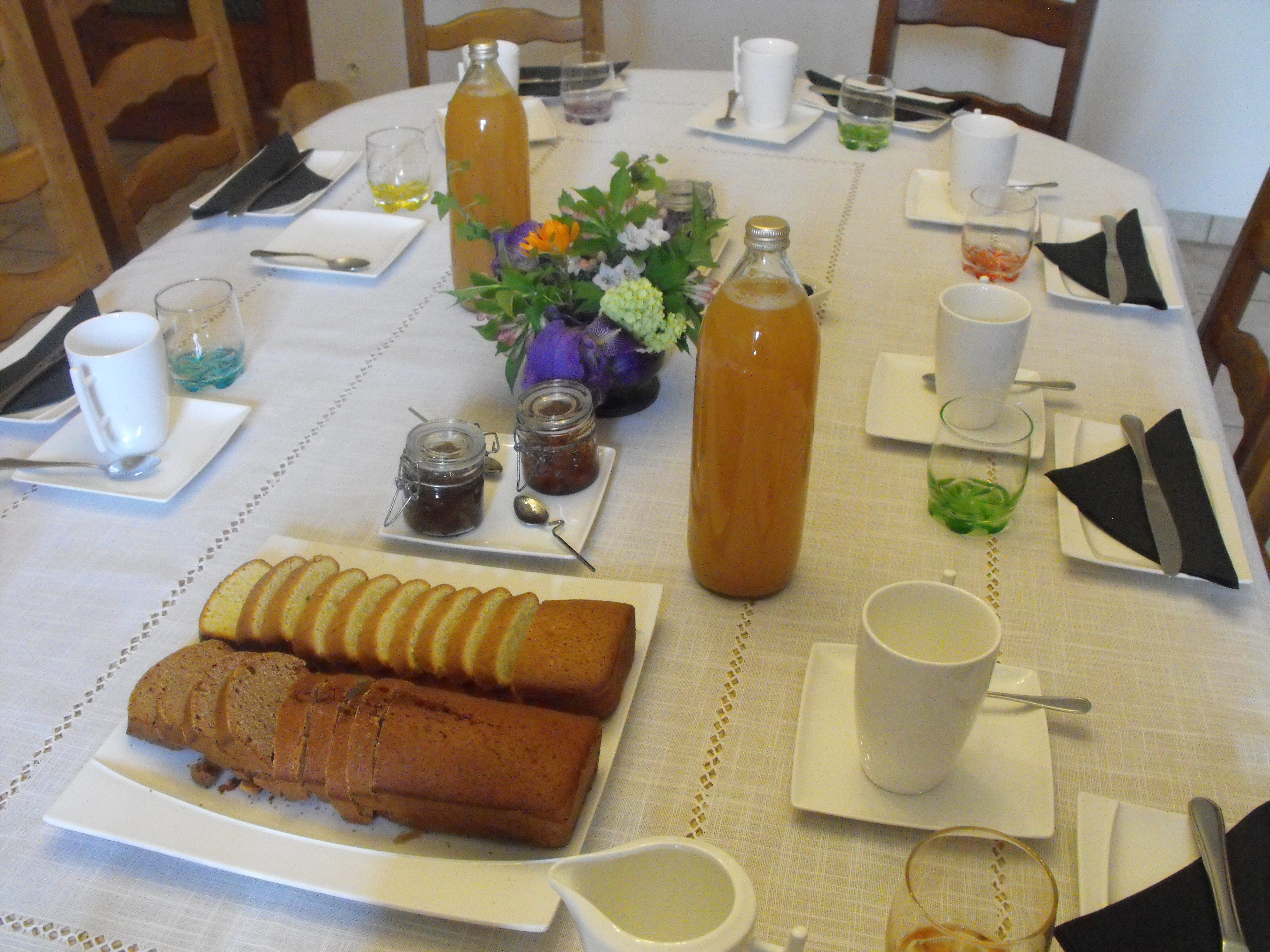 Le petit déjeuner servi dans la salle à manger ou le jardin est l'occasion de vous faire déguster confitures maison , douceurs du jour, produits bio, spécialités du terroir, boissons et pains variés. Nous nous adaptons à vos préférences alimentaires (sans oeufs, sans lait, sans gluten etc)