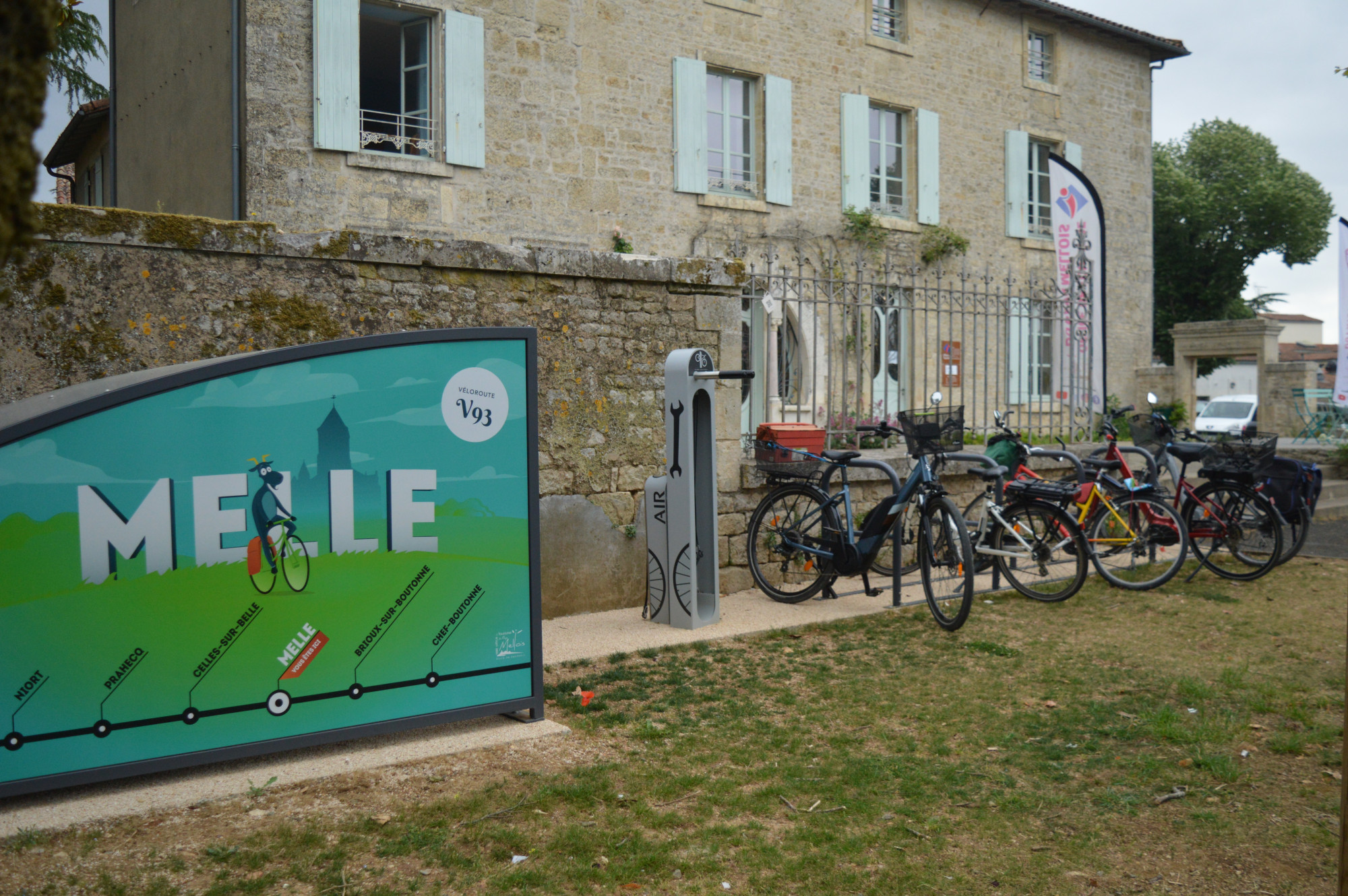 Station de réparation et box sécurisées devant l’Office de Tourisme, 2 place Bujault à Melle. Possibilité de recharger les téléphones et la batterie de votre vélo.